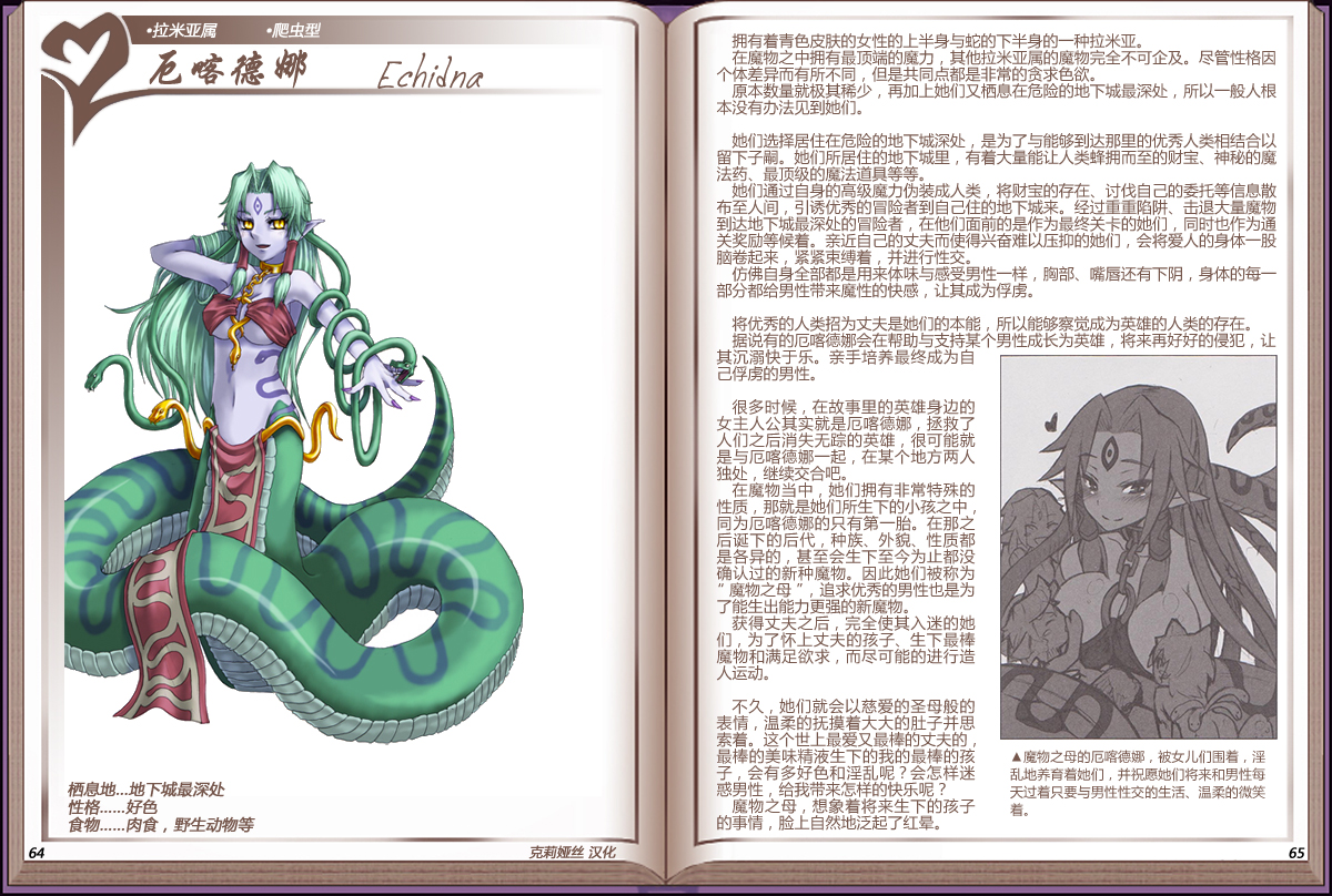 在魔物当中,她们拥有非常特殊的性质,那就是她们所生下的小孩之中,同为厄喀德娜的只有第一胎。在那之后诞下的后代,种族、外貌、性质都是各异的,甚至会生下至今为正都没确认过的新种魔物。因此她们被称为“魔物之母”,追求优秀的男性也是为了能生出能力更强的新魔物。