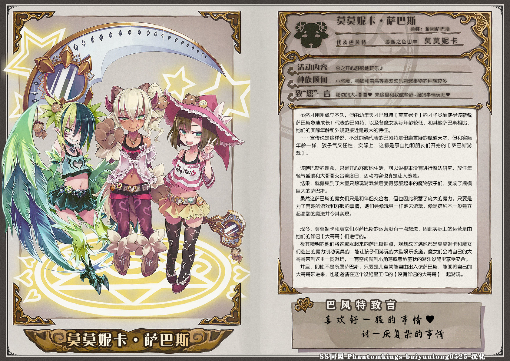 虽然才刚刚成立不久,但由幼年天才巴风特【莫莫妮卡】的才华觉醒使得该新锐萨巴斯急速成长!代表的巴风特、以及各魔女实际年龄较低,和其他萨巴斯相比,她们的实际年龄和外观更接近是最大的特征。